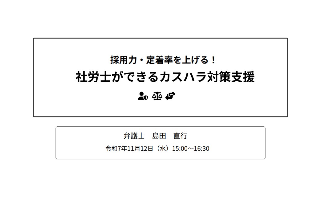 現在、多くの企業で「採用ができない」「人がすぐ辞めてしまう」といった悩みが深刻化しています。こうした状況においては、労働条件や待遇だけでなく、働きやすさや安心感といった心理的要素が重視されるようになります。  その中で大きな障害となっているのが、顧客や利用者によるカスタマーハラスメント、いわゆる「カスハラ」です。カスハラを受けた従業員が離職する事例は後を絶たず、また、職場のストレス要因として定着リスクを高める温床ともなっています。さらに、採用希望者が企業を選ぶ際にも「企業がハラスメントから守ってくれるかどうか」は重要な判断基準になってきています。  本セミナーでは、こうした構造的課題に対し、社労士がどのように企業を支援できるのかを具体的に提示します。単なる制度整備ではなく、「採用力」「定着率」「組織の持続性」という観点から、社労士が経営支援の一環として提供すべき実務対応を明確化していきます。また、従業員保護の観点からは、カスハラの被害を受けた労働者へのフォローアップ体制の重要性についても解説します。  顧問先からカスハラの相談を受けることがある、これからカスハラ対策を重点的に支援していきたい、そんな先生方には必見のセミナーです!