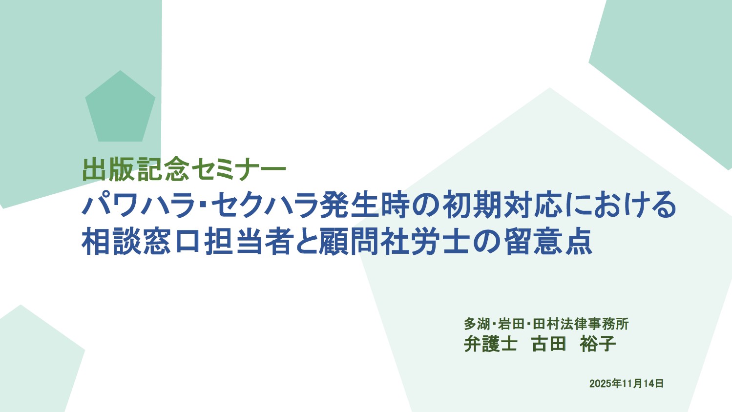 企業の規模を問わず、パワハラの防止措置が義務化されてから3年以上が経過し、ハラスメント相談窓口の設置は進んでいます。  しかし、いざ相談が寄せられたとき、相談窓口の担当者が「具体的にどう動けばいいのか」と対応に悩むことは少なくありません。また、顧問先の企業から、社労士の先生が対応についてのアドバイスを求められるケースや外部窓口を依頼されることも増えています。  そのため、それぞれの立場で、事前に対応方法や注意点を整理しておくことが非常に重要です。  本セミナーでは、ハラスメントのうちパワハラ・セクハラに絞り、問題が生じた場合の相談窓口における対応の留意点や、どのように他部署との連携をとり、調査、処分等の対応をしていくべきか、そして社労士の立場における留意点等について、わかりやすく解説します。