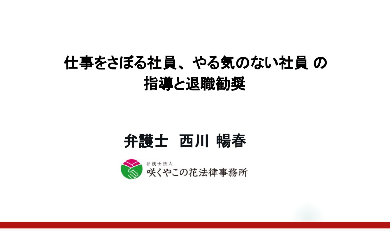 「業績改善に無関心で最低限の基準ぎりぎりでしか働かない」、「指示待ち· 受け身の姿勢で積極性がない」、「やりましたと嘘の報告をする」。そんな仕事をさぼる社員ややる気のない社員についてどのように改善指導すればよいか、というご相談をいただくことがあります。あるいは、このような社員について改善が期待できずやめてもらいたいがどうすればよいか、というご相談をいただくこともあります。これらの社員に対する注意・指導をきっかけに「パワハラだ」「メンタル不調になった」と言われてしまい、対応に苦慮する例も見られます。今回の講演では、実際の裁判例や、咲くやこの花法律事務所における実践による対応ノウハウを踏まえながら、「仕事をさぼる社員」「やる気のない社員」に焦点を当てて、具体的な指導・対応の手順を解説します。さらに、ご質問いただくことが多い「問題社員にだけ日報を書かせる」ことは法的に問題ないのか、「人事評価結果によって減給する」ことは適法なのかといったテーマについても解説します。