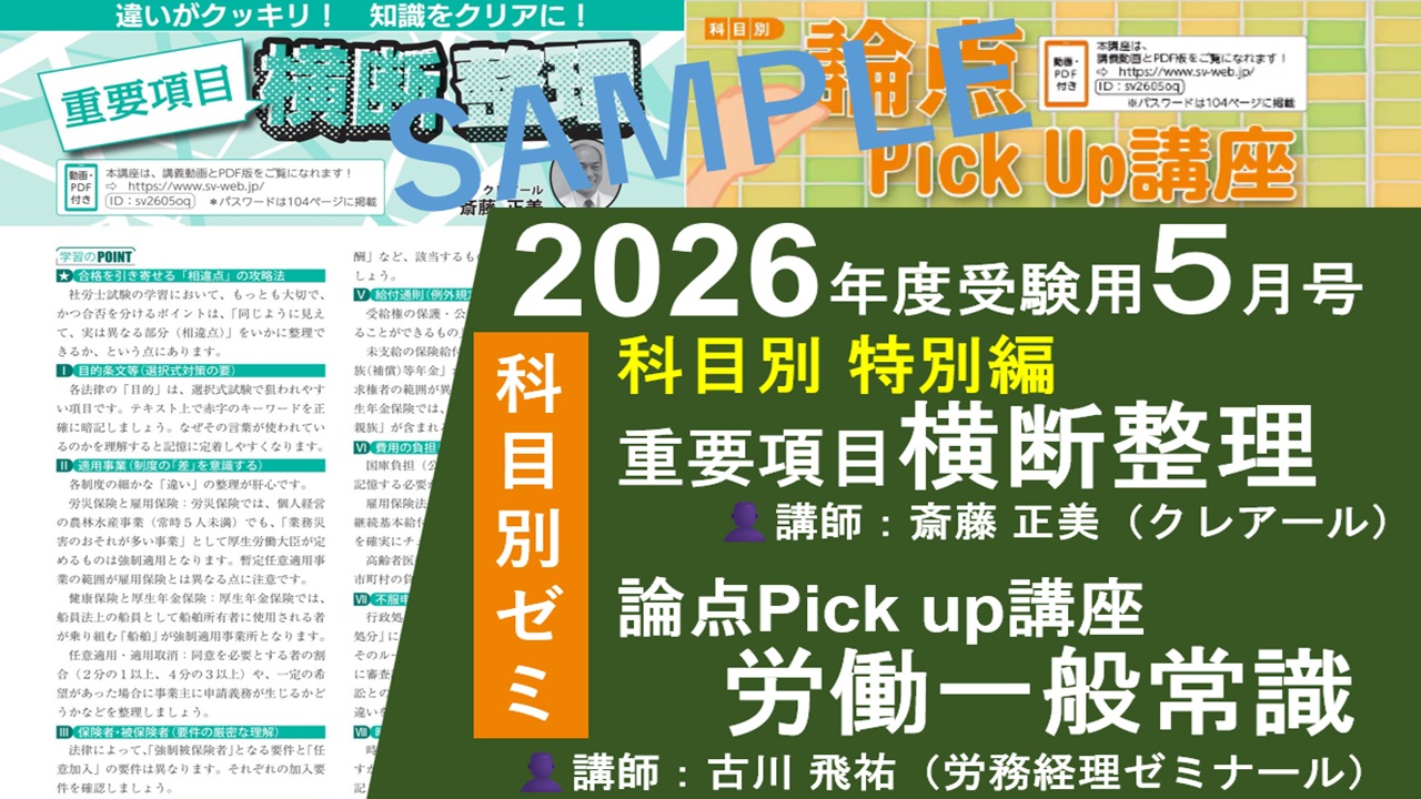 - 5月号「重要項目横断整理」「数字・申請規定の意味付け記憶法」「論点Pick up講座〈労働一般常識〉」「改正ポイント」の動画をアップしました。
