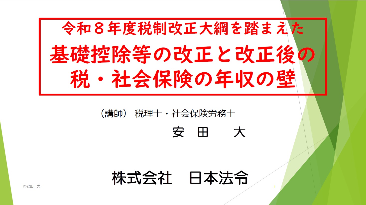令和7年12月19日、「令和8年度税制改正大綱」が公表されました。今回の改正では、所得税を中心に基礎控除など複数の項目に変更が加えられる見込みであり、実務への影響が広がることが予想されます。特に注目されているのが、所得税がかかり始める「年収の壁」の178万円への引上げで、マスコミでも大きな話題となりました。本セミナーでは、まず令和8年度税制改正大綱の内容を、13項目に分けて解説します。そして、これを受けて税の「年収の壁」はどう変わるのか、関連して、社会保険の「年収の壁」はどうなるのか、今後の方向性についても取り上げます。さらに、令和8年4月1日から施行予定の健康保険における被扶養者の認定基準の改正についても解説し、実務に関わる最新情報をお届けします。企業の人事労務・給与計算担当者や社会保険労務士など、いち早く改正に備えたいという方にお勧めです!※※※2026年1月7日に収録した講義を期間限定で配信いたします。今後の国会審議等により、内容が変更になる可能性がございます。※※※【配信期間】2026年1月16日(金)10:00~2026年3月31日(火)23:59