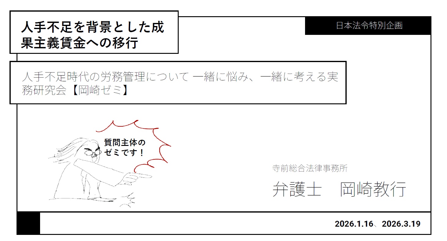 近年、人手不足を背景として成果主義賃金に移行したいという相談が増えています。本ゼミでは、「人手不足」に悩む企業が待遇面で強気な労働者から要求をされた場合にどのように対応すればよいかを、毎回、受講生や講師である岡崎弁護士が実際に受けた相談をベースに研究しています。中でも、成果主義賃金に移行するというケースでは、就業規則の不利益変更問題への対応や人事制度の見直しを伴うため、事前準備、および新たな制度に移行するまでの実務において慎重かつ適切な対応が求められます。そこで、2回にわたってこのテーマを集中的に取り上げて解説しています。