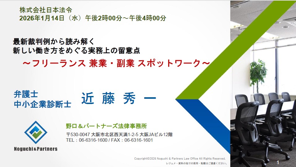 本セミナーでは,ビジネスガイド1月号の掲載記事『新しい働き方をめぐる最新裁判例と実務』で取り上げた新しい働き方をめぐる実務上の留意点について,記事では紹介しきれなかった労働者性に関する裁判例等も交えて解説します。